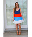 A mini dress featuring an allover colorblock design, v-neck neckline, adjustable straps, and a tiered, flowy silhouette.