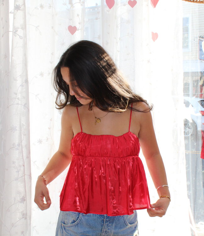 A flirty and feminine cami featuring a soft, flowy silhouette with delicate spaghetti straps and a subtle sheen throughout. Designed with a relaxed fit that drapes beautifully, this top pairs effortlessly with denim or skirts for an easy day-to-night look. Perfect for warm days, layering, or adding a pop of romantic color to your outfit.