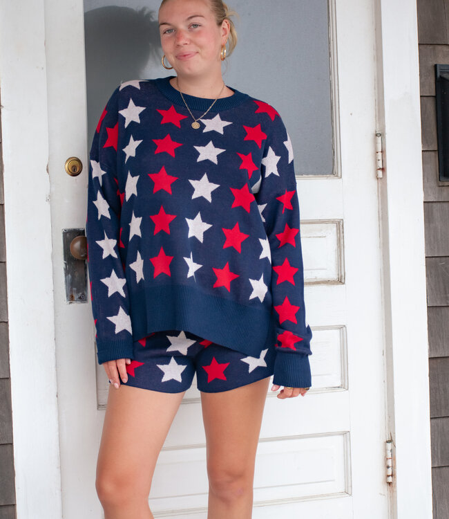 Bold, cozy, and made to stand out—this navy knit sweater features a playful allover red and white star print that's perfect for patriotic weekends or just repping a little Americana charm. It’s soft, relaxed, and pairs perfectly with the matching shorts or denim cutoffs.