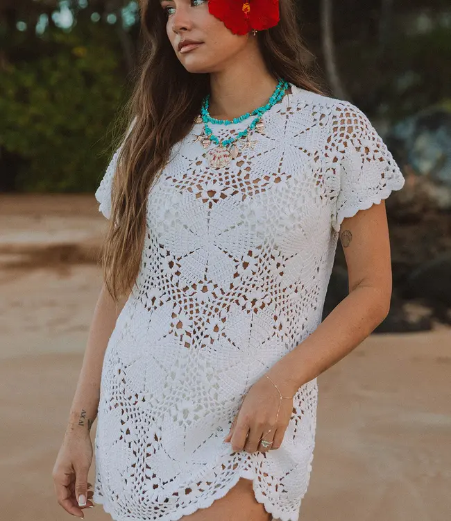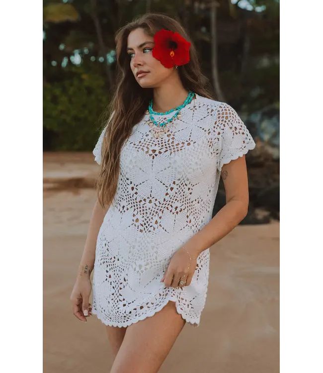 Crochet is having a moment and we are all about it! This white crochet mini dress is the perfect coverup for beach to poolside bar. Short sleeve and mini length, this is fun and flirty while providing coverage. For added length, we suggest sizing up!