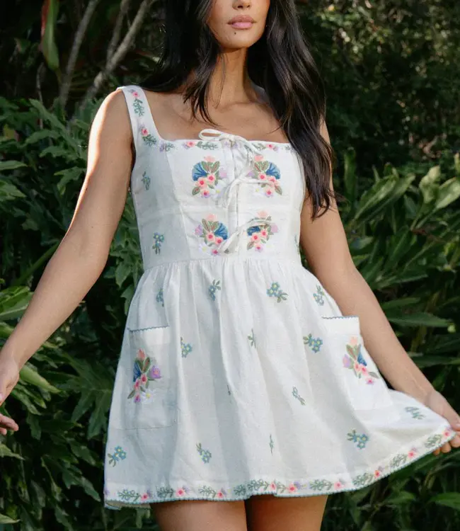 The Demi Mini Dress is a romantic, feminine piece designed with delicate floral embroidery and a flattering corset-style bodice. Featuring dainty front ties and a soft, structured fit, it cinches the waist while staying comfortable. Perfect for daytime plans or dressed up for special occasions.