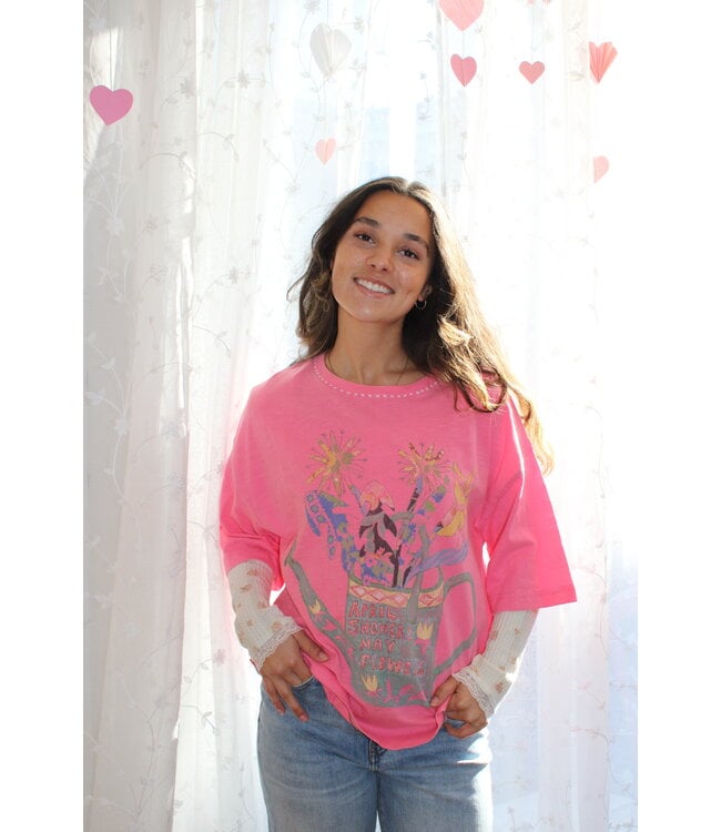 Step into spring with the In Bloom Tee by Free People. This oversized pink graphic tee features a hand-drawn watering can filled with wildflowers and the phrase “April Showers, May Flowers.” With a relaxed fit and soft cotton feel, it’s perfect for easy days and all your spring plans.