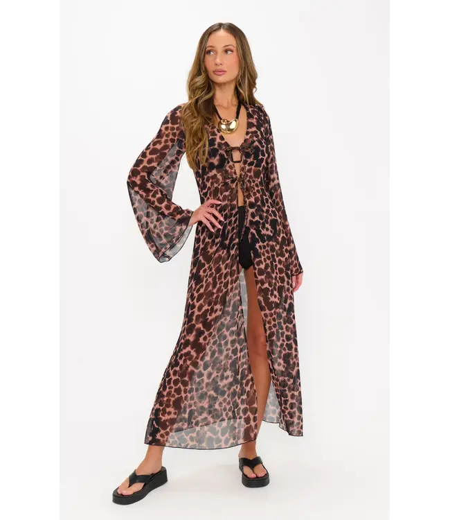 The Jet Setter Robe is here to get the vacation vibes started! This lightweight robe is decorated in a tortoise shell print with a flirty open front, and adjustable ties that cinch at the bust. Long, kimono sleeves adds a breezy and stylish touch to this maxi silhouette.