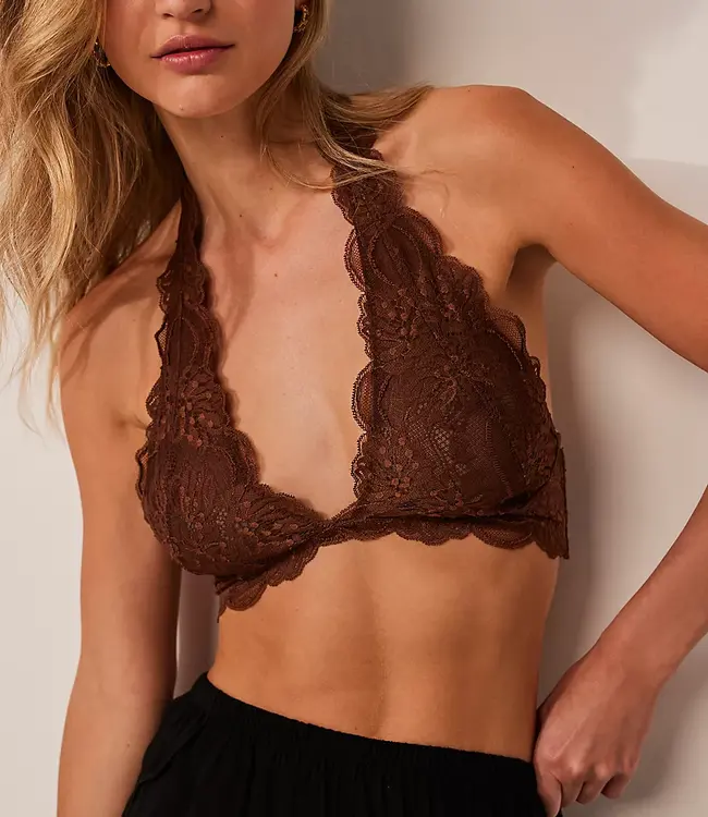 Forever timeless and so femme, this lacey bralette is featured in a halter-style with scallop trim and a deep V-neckline.