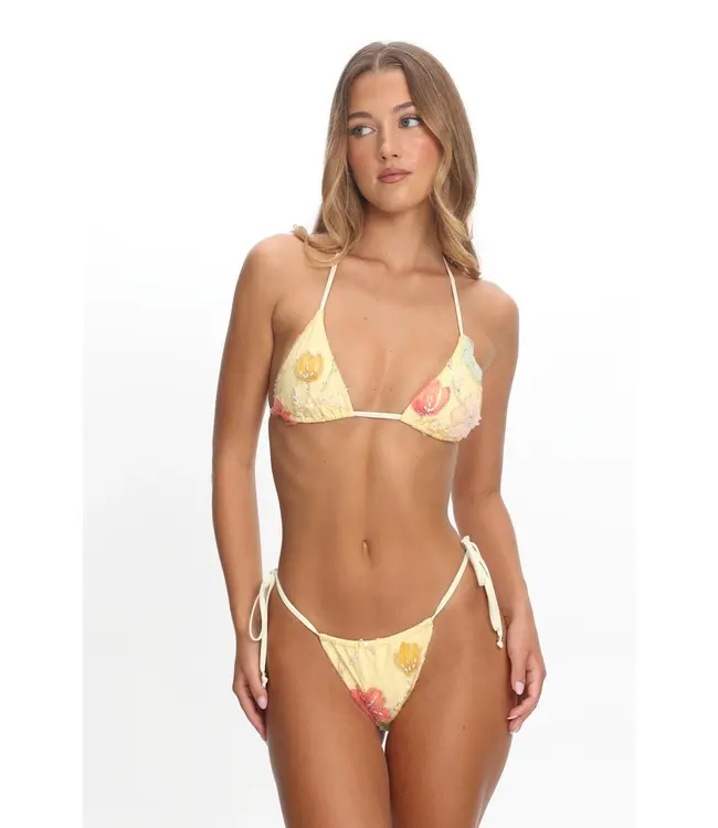 Triangle bikini top with halter ties, adjustable fit, and sparkling floral appliqués. Lightweight, flattering, and perfect for a standout beach look. Read more.