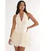 Structured satin halter dress with deep V-neck, ruched bust, corset waist, and tiered tulle skirt with scalloped 3D petal hem for a flirty look.