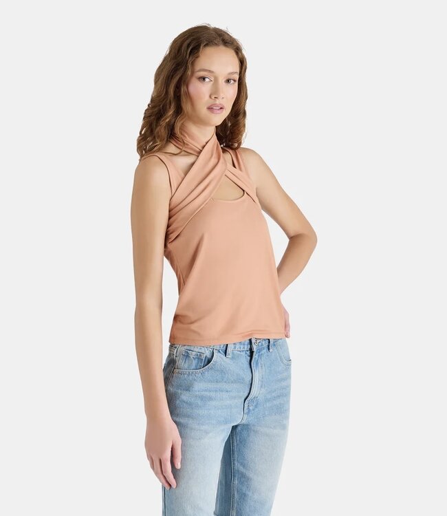 a tank top with a unique crisscross design. This top offers a fashion-forward style with its innovative design, perfect for making a statement. Made with high-quality materials for a comfortable fit.