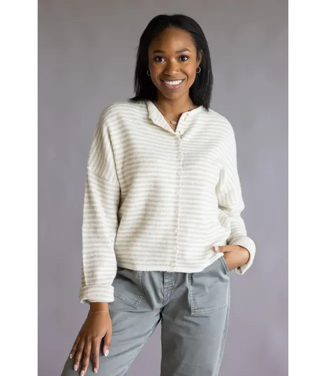 Soft and cozy cardigan in mini stripes - lightweight and rolled edge finish on the sleeves and collar.