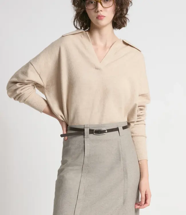 A refined essential crafted in a soft, breathable knit. Featuring a classic collar, button-front neckline, and an easy, flattering fit, this versatile neutral pairs effortlessly with denim or tailored pieces for polished everyday style.