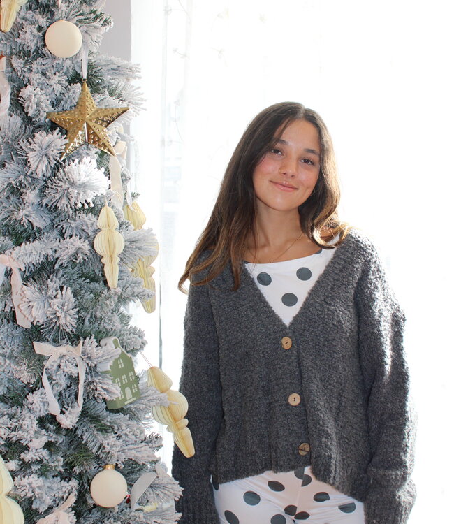 Wrap yourself in effortless comfort with this ultra-soft, textured cardigan. Designed with a relaxed, slouchy silhouette, it features wide sleeves and a slightly cropped hem for a modern, laid-back look. The chunky knit adds warmth without feeling heavy, making it perfect for lounging at home or layering over your favorite outfits. Finished with oversized wooden-style buttons, this cardigan brings a touch of rustic charm to any winter wardrobe. Made in Italy.