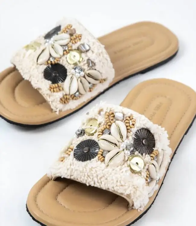 So bold and beachy, these slip-on sandals are the perfect statement for sunny days. Designed with a wide cotton strap and eye-catching shell embellishments, they bring effortless coastal charm to any outfit. Easy to wear and endlessly fun, they pair perfectly with breezy dresses or your favorite denim.