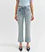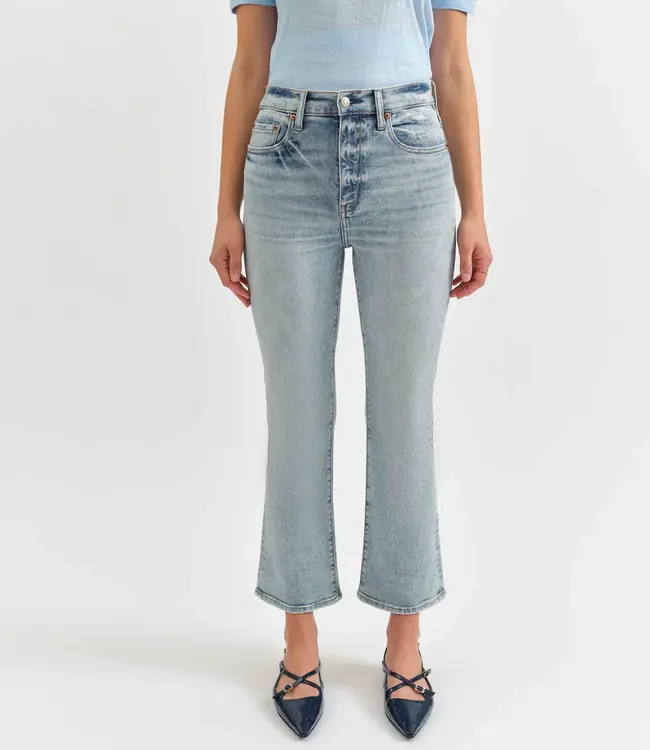 The Shy Girl in Miracle is a flirty high rise cropped kick flare jean in a vintage-inspired light wash featuring dynamic highs and lows.