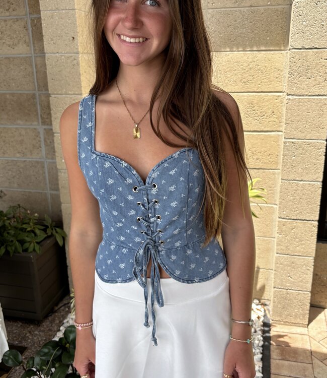 Fall in love with this dreamy denim bustier top—delicate shaping, vintage charm, and a silhouette that flatters with every glance.