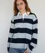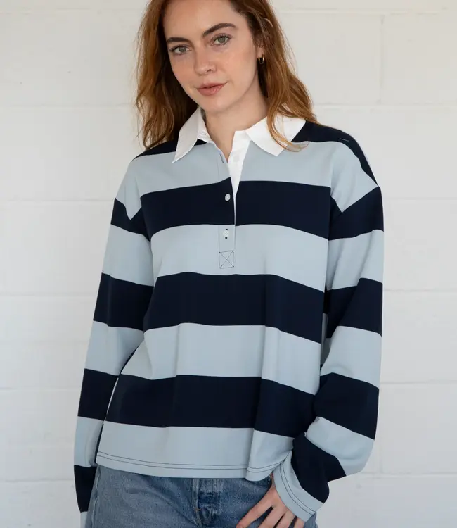 The Stevie Top is a relaxed, striped long-sleeve polo featuring a soft cotton-blend fabric, classic collar, and effortless fit—perfect for casual everyday styling with a touch of laid-back charm.
