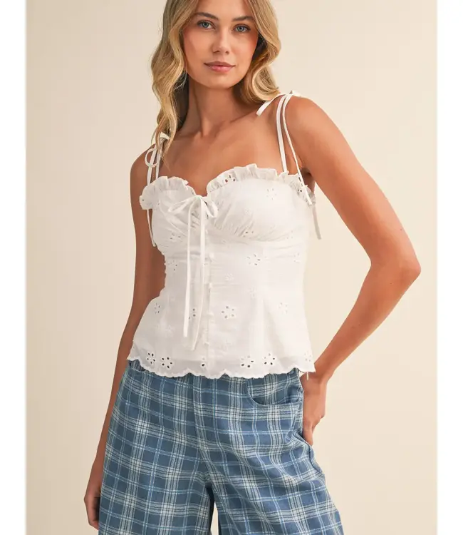 Tate Eyelet Peplum top with eyelet fabric and a structured, fitted design. Lightweight and flattering, perfect for warm days or elevated styling.