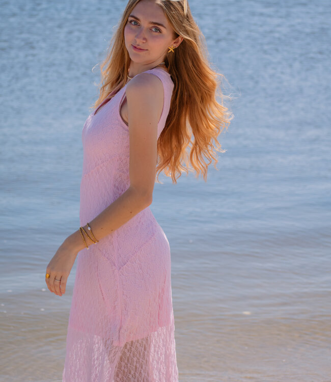 A perfect pink sheer dress with a pastel slip for the perfect coverage. With its body-hugging silhouette and soft stretch, it flatters without clinging, making it your go-to for sun-drenched days and golden hour strolls.