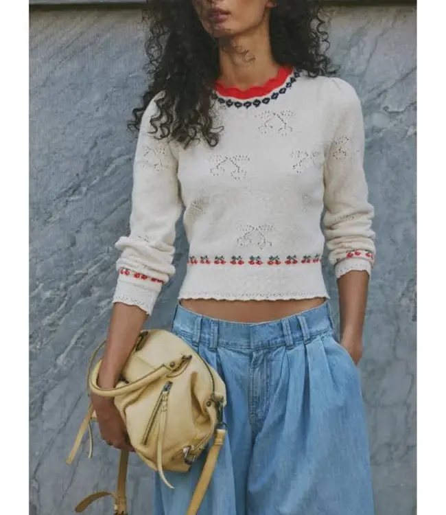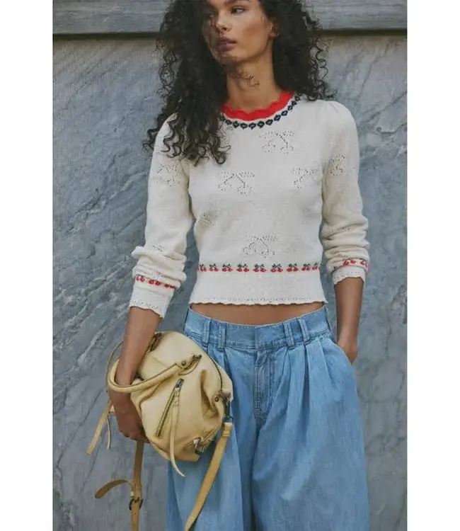Playful yet polished, the Tilly Pullover adds a fun twist to your everyday knitwear. Designed with a pointelle bow motif and contrast embroidery, this sweater features a scalloped jewel neckline and a subtly cropped fit for a fresh, flattering look. Easy to style with denim or skirts, it’s the perfect throw-on piece with personality.