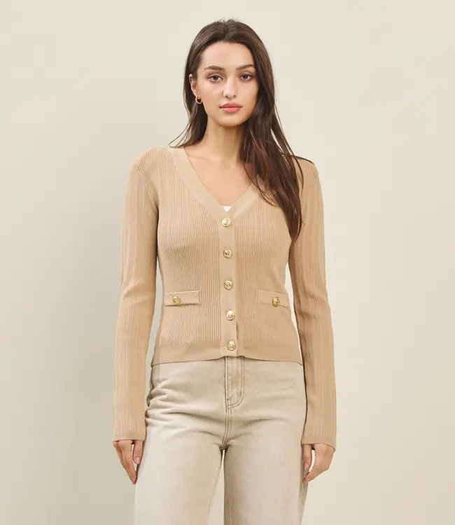 A timeless neutral cardigan with a polished twist. Designed in a soft ribbed knit with a flattering V-neckline, gold button detailing, and front pocket accents, this piece adds instant sophistication to any look.
