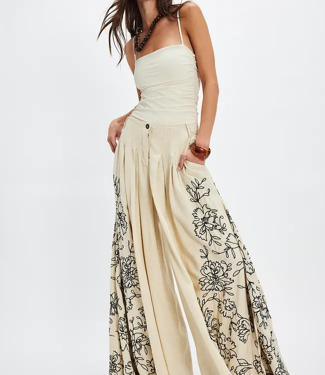 So boldly embroidered, these unique pants are featured in a billowy wide-leg fit with floral embroidery at the sides and pleating at the top for added shape.